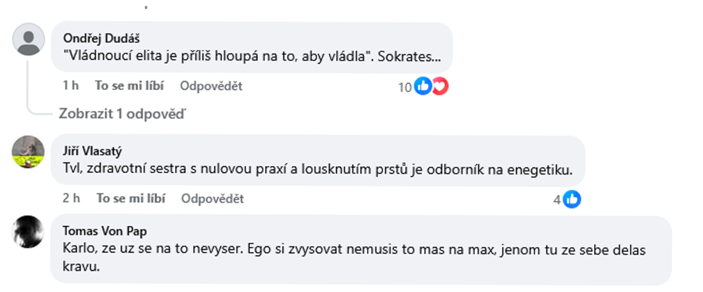 Když se jí občané ptají, zda by raději nenapsala něco o tom, co užitečného a prospěšného na ministerstvu dělá pro občany, tak takové komentáře po chvíli zmizí a zůstávají jen ty, které tvoří dokonalou persifláž odpovídající politické kultuře ex-poslankyně SPD, nejspíš také politické trafikantky, která dostala od voličů jasnou stopku a Okamura ji na ministerstvo na politickou funkci uklidil.